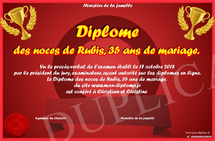Envoyez par email votre Diplôme des noces de Rubis, 35 ans de mariage. personalisé