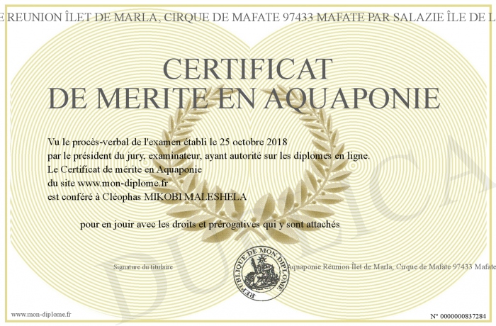 Envoyez par email votre Certificat de mérite en Aquaponie personalisé