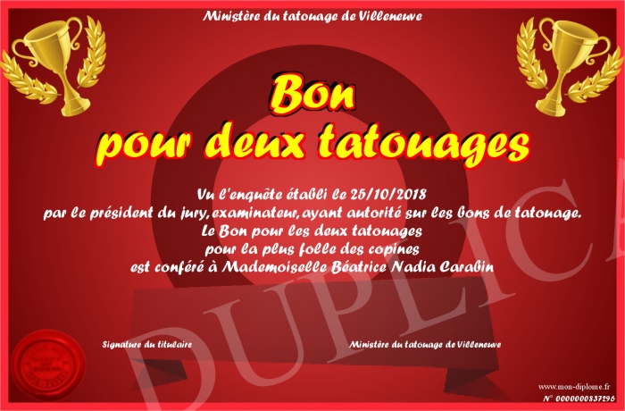 Envoyez par email votre Bon pour deux tatouages personalisé