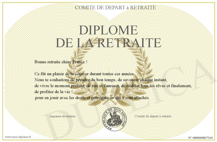 Envoyez par email votre Diplôme de la retraite personalisé