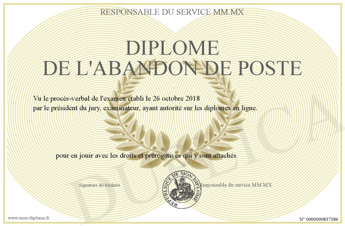 Envoyez par email votre Diplôme de l'abandon de poste personalisé