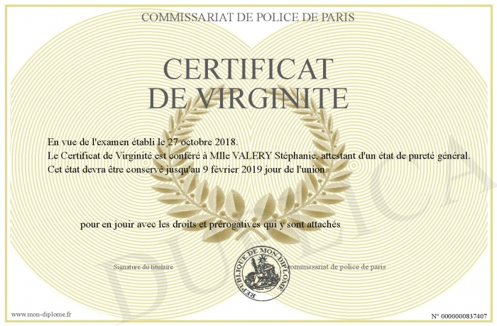 Envoyez par email votre Certificat de virginité personalisé