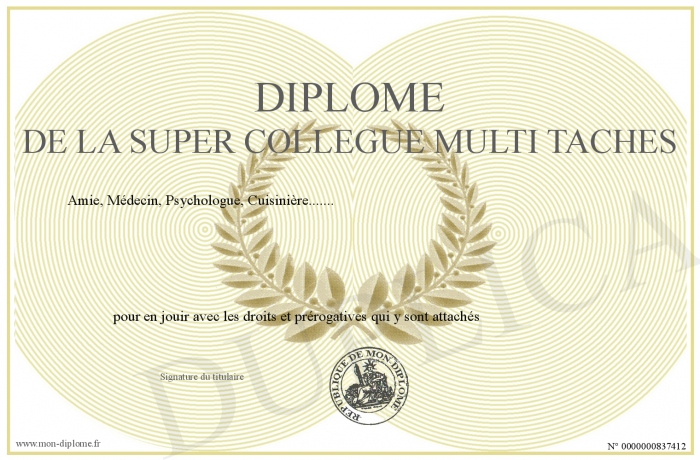 Envoyez par email votre Diplôme de la super Collègue Multi tACHES personalisé