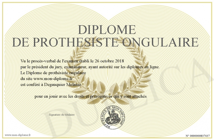 Envoyez par email votre Diplôme de prothésiste ongulaire personalisé