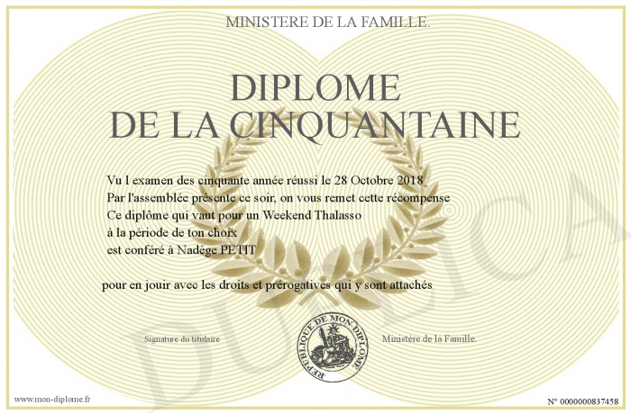 Envoyez par email votre Diplôme de la cinquantaine personalisé