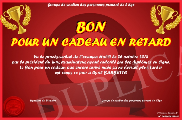 Envoyez par email votre BON POUR UN CADEAU EN RETARD personalisé