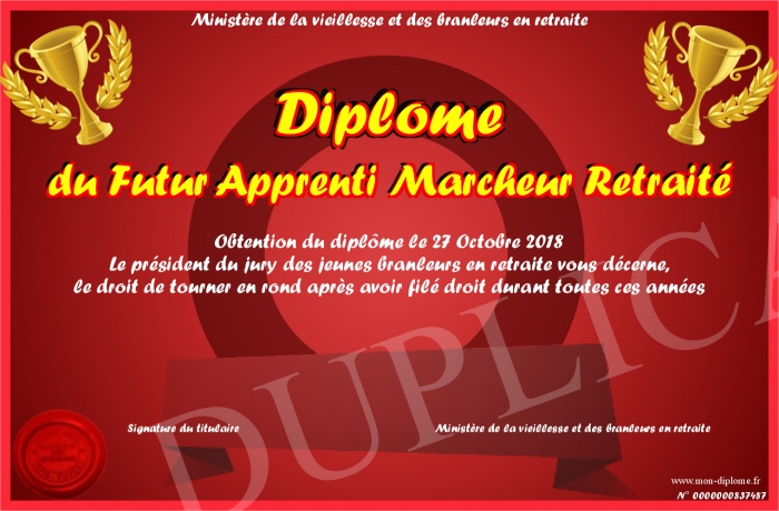 Envoyez par email votre Diplôme du Futur Apprenti Marcheur Retraité personalisé