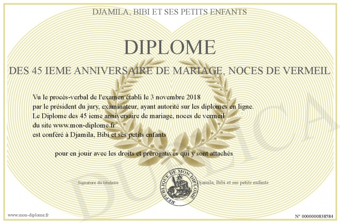 Envoyez par email votre Diplôme des 45 ieme anniversaire de mariage, noces de vermeil personalisé