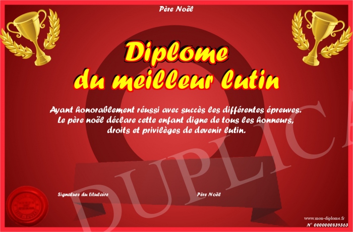 Envoyez par email votre Diplôme du meilleur lutin personalisé