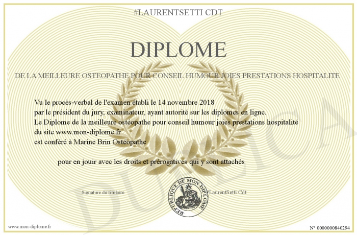 Envoyez par email votre Diplôme de la meilleure ostéopathe pour conseil humour joies prestations hospitalité personalisé