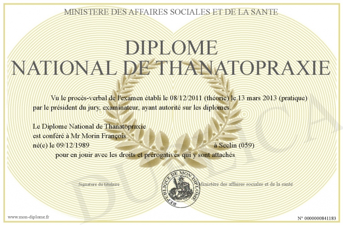 Envoyez par email votre Diplôme National de Thanatopraxie personalisé
