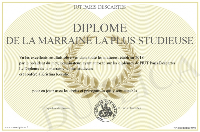 Envoyez par email votre Diplôme de la marraine la plus studieuse personalisé