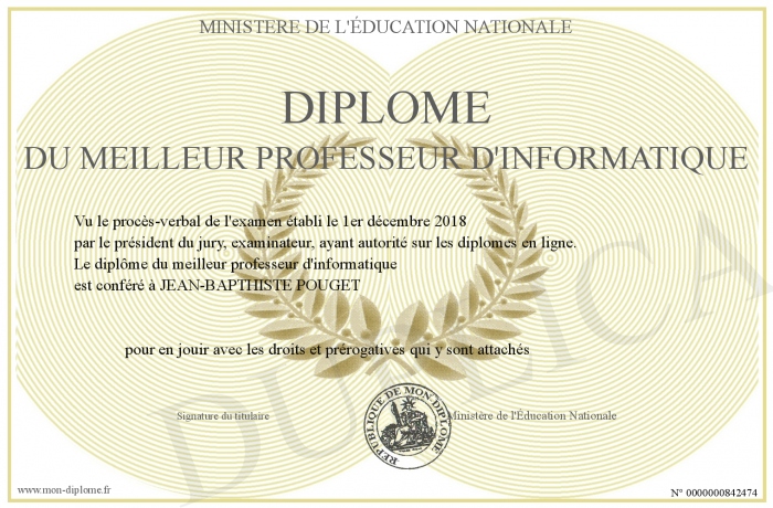 Envoyez par email votre Diplôme du meilleur professeur d'informatique personalisé