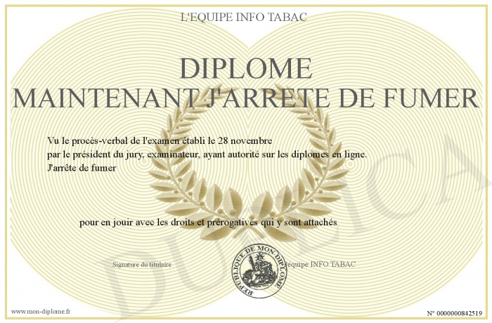 Envoyez par email votre DIPLOME Maintenant J'ARRETE DE FUMER personalisé