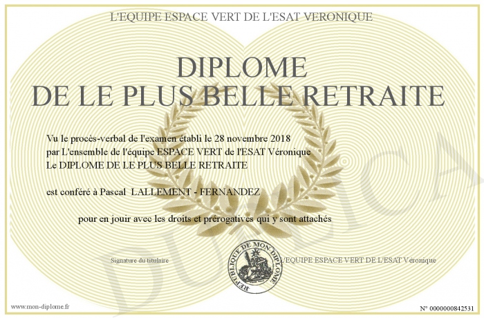 Envoyez par email votre DIPLOME DE LE PLUS BELLE RETRAITE personalisé