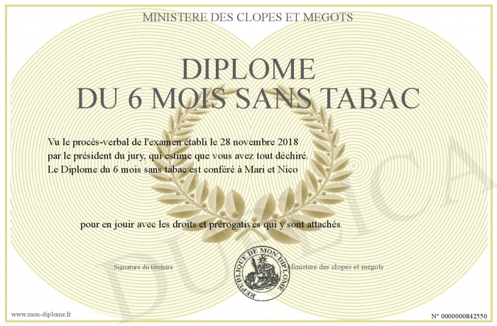 Envoyez par email votre Diplome du 6 mois sans tabac personalisé