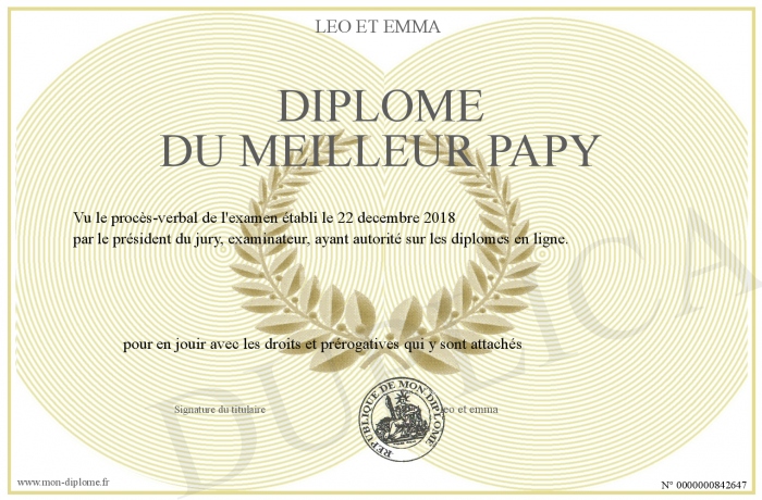 Envoyez par email votre Diplôme du meilleur papy personalisé