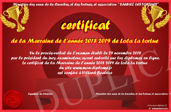 Envoyez par email votre certificat de la Marraine de l'année 2018 2019 de Lola La tortue personalisé