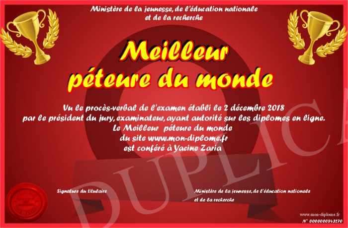 Envoyez par email votre Meilleur péteure du monde personalisé