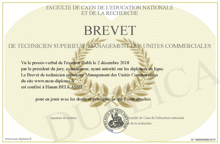 Envoyez par email votre Brevet de technicien superieur Management des Unités Commerciales personalisé