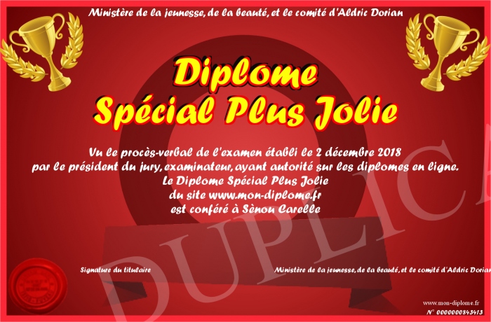 Envoyez par email votre Diplôme Spécial Plus Jolie personalisé
