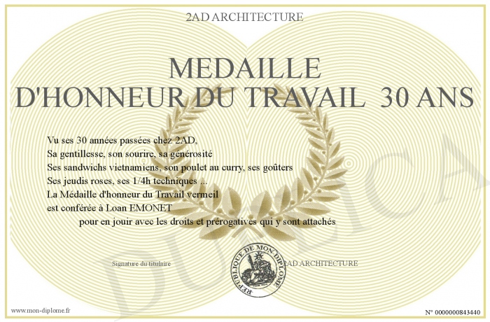 Envoyez par email votre Médaille d'honneur du travail 30 ans personalisé