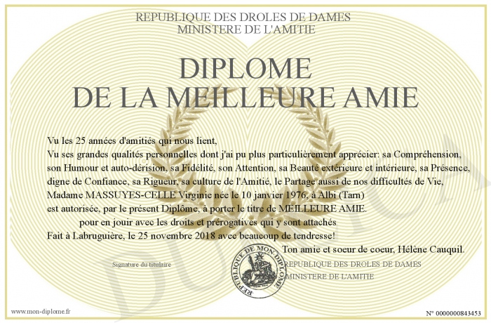 Envoyez par email votre Diplôme de la MEILLEURE AMIE personalisé