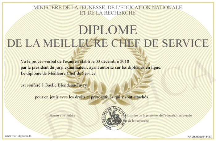 Envoyez par email votre Diplôme de la Meilleure Chef de Service personalisé