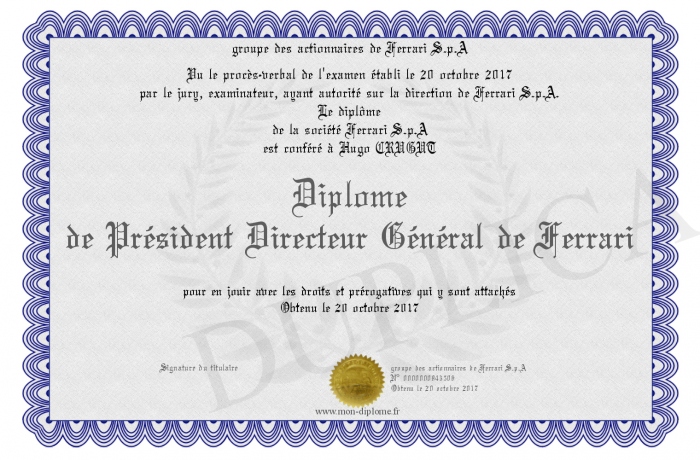 Envoyez par email votre Diplôme de Président Directeur Général de Ferrari personalisé