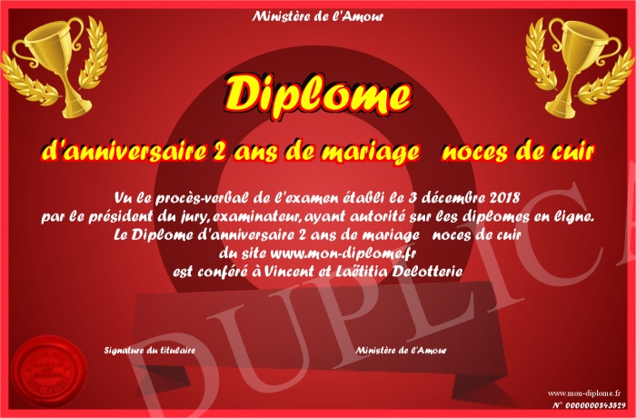 Envoyez par email votre Diplôme d'anniversaire 2 ans de mariage noces de cuir personalisé