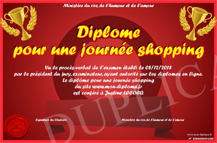 Envoyez par email votre Diplôme pour une journée shopping personalisé