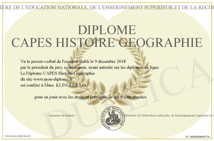 Envoyez par email votre Diplôme CAPES Histoire Géographie personalisé