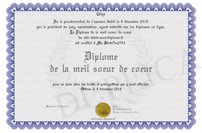 Envoyez par email votre Diplôme de la meil soeur de coeur personalisé
