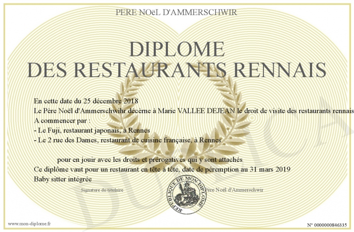 Envoyez par email votre Diplôme des restaurants rennais personalisé