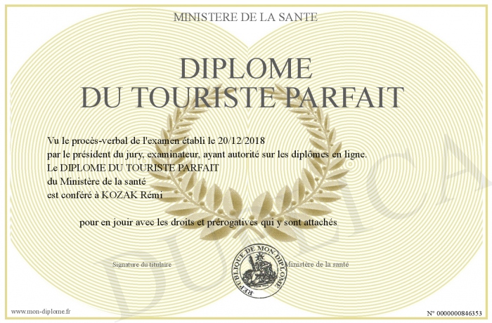 Envoyez par email votre Diplôme du touriste parfait personalisé