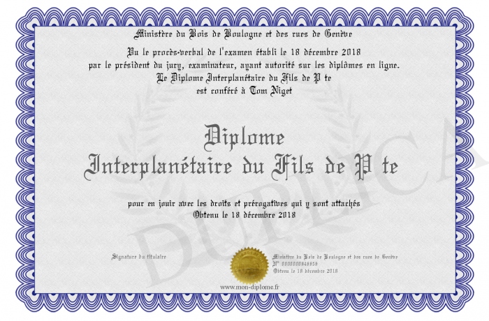 Envoyez par email votre Diplome Interplanétaire du Fils de P te personalisé