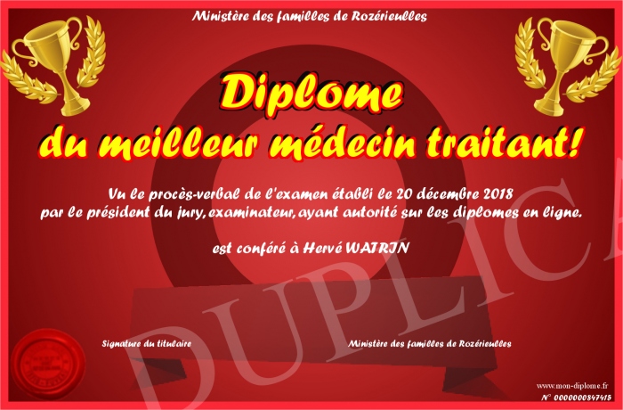 Envoyez par email votre Diplôme du meilleur médecin traitant! personalisé