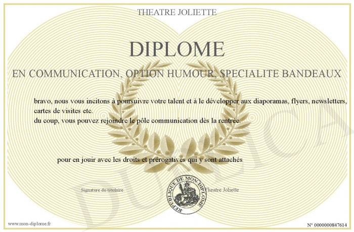 Envoyez par email votre Diplôme en communication, option humour, spécialité bandeaux personalisé