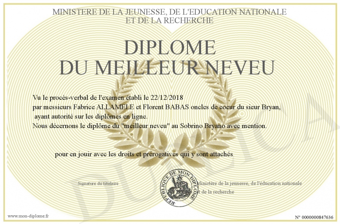 Envoyez par email votre Diplôme du meilleur neveu personalisé