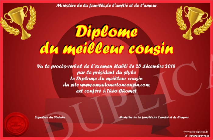 Envoyez par email votre Diplôme du meilleur cousin personalisé