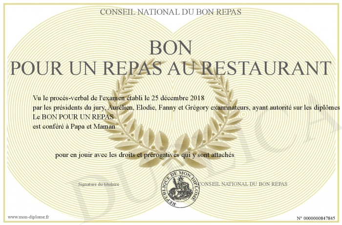 Envoyez par email votre BON POUR UN REPAS AU RESTAURANT personalisé