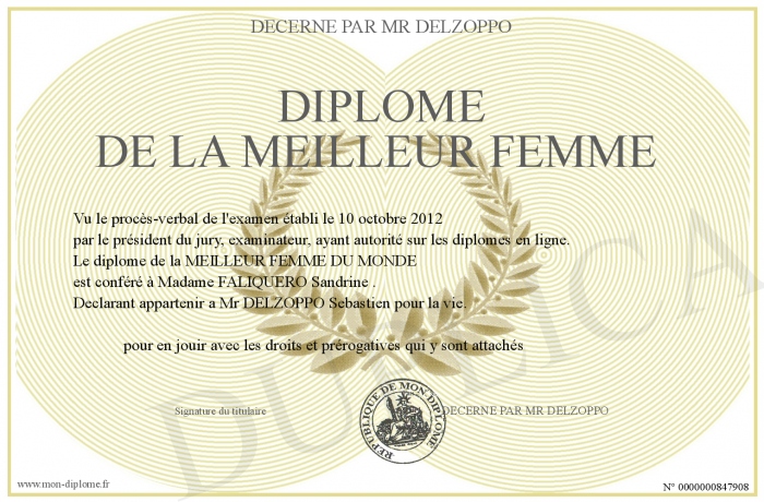 Envoyez par email votre Diplôme de la meilleur femme personalisé