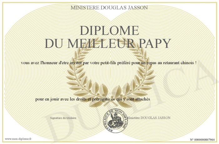 Envoyez par email votre Diplôme du meilleur papy personalisé