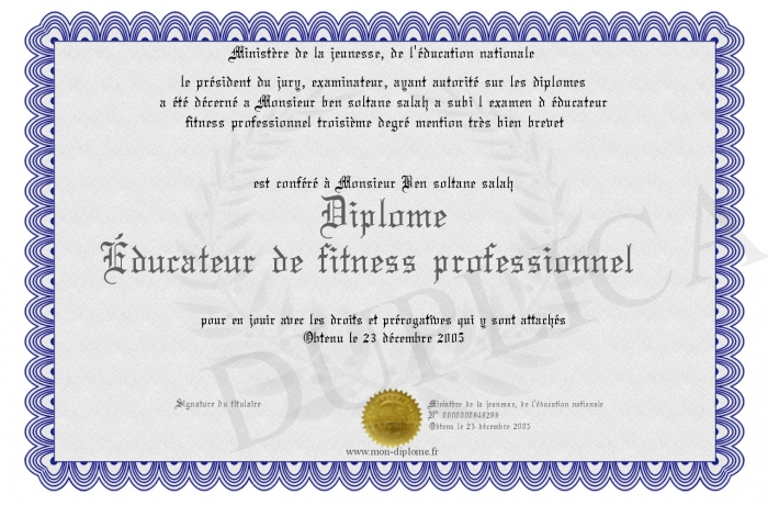 Envoyez par email votre Diplôme Éducateur de fitness professionnel personalisé