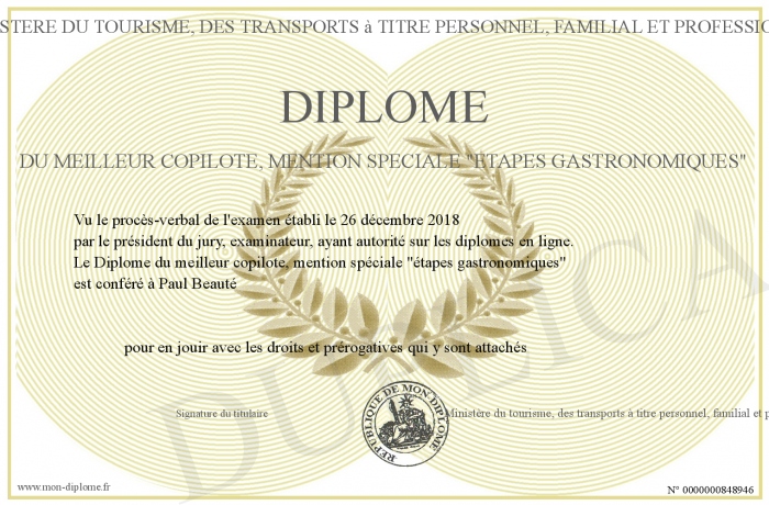 Envoyez par email votre Diplôme du meilleur copilote, mention spéciale -étapes gastronomiques- personalisé