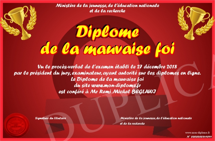 Envoyez par email votre Diplôme de la mauvaise foi personalisé
