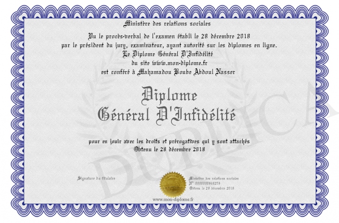 Envoyez par email votre Diplôme Général D'Infidélité personalisé