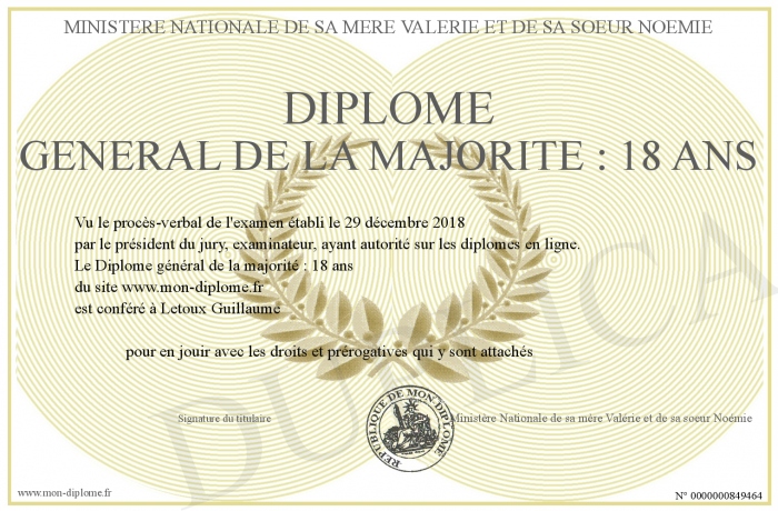 Envoyez par email votre Diplôme général de la majorité : 18 ans personalisé