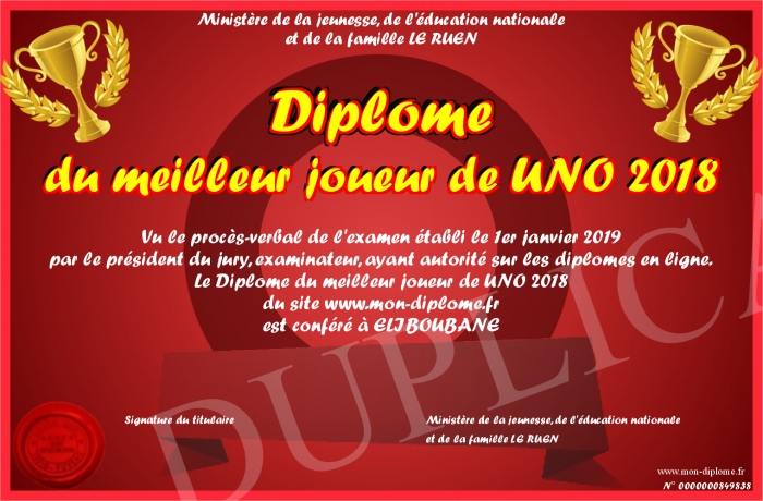 Envoyez par email votre Diplôme du meilleur joueur de UNO 2018 personalisé