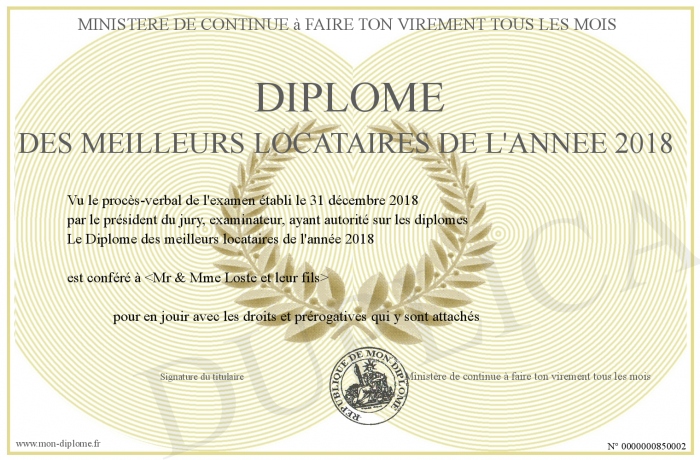 Envoyez par email votre Diplôme des meilleurs locataires de l'année 2018 personalisé